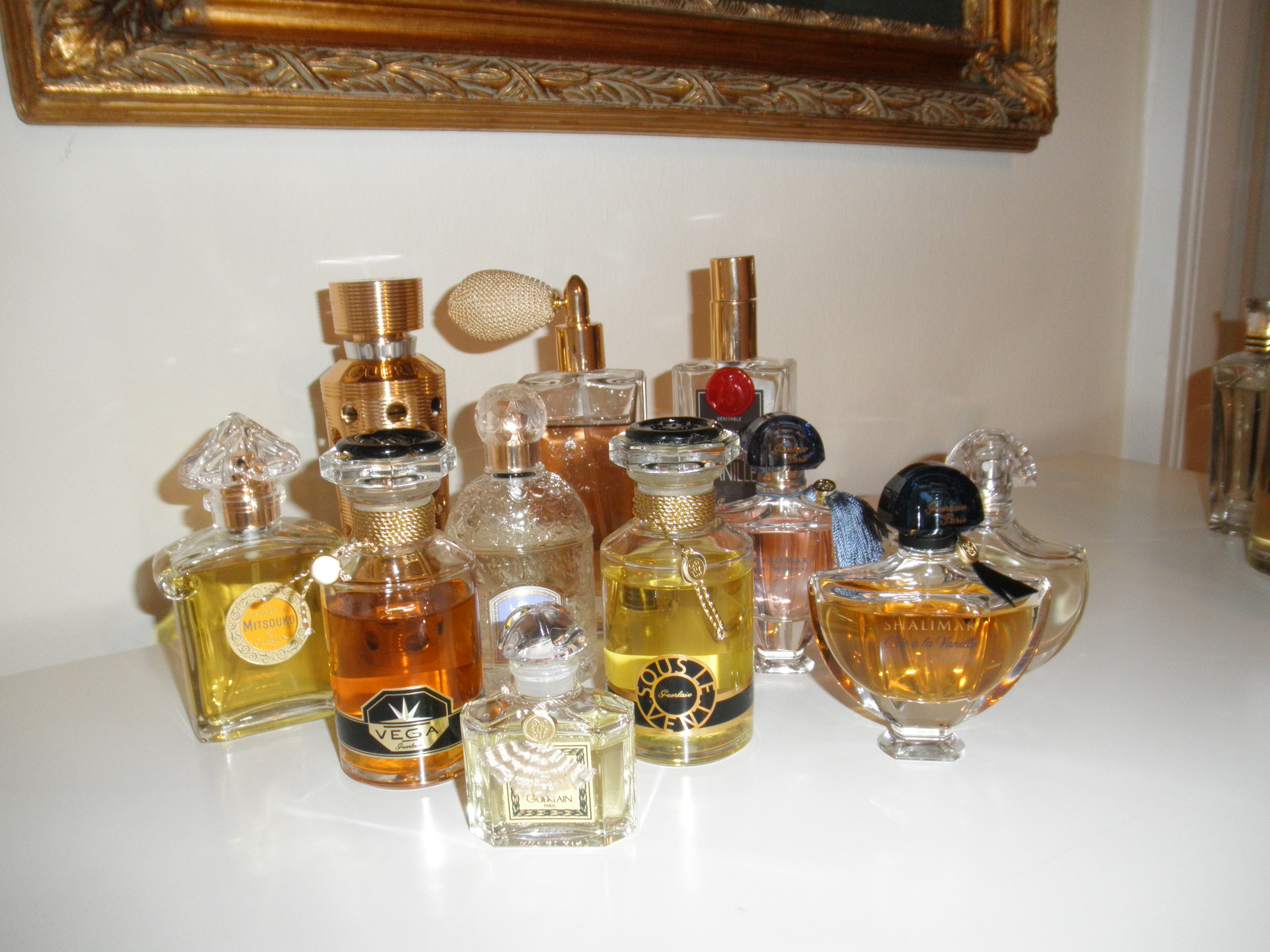 My Guerlains (from left to right in front): Mitsouko EdP, Vega, Jicky Extrait, Aprés L'Ondée, Sous le Vent, Shalimar Parfum Initial, Shalimar Ode à la Vanille, Eau de Shalimar. Back Row: Vol de Nuit EdT, Iris Ganache, Spiritueuse Double Vanille;