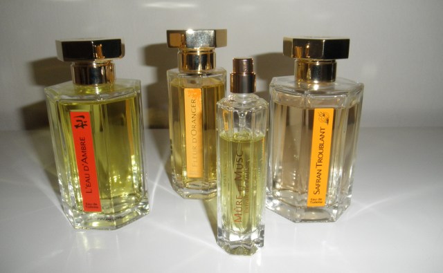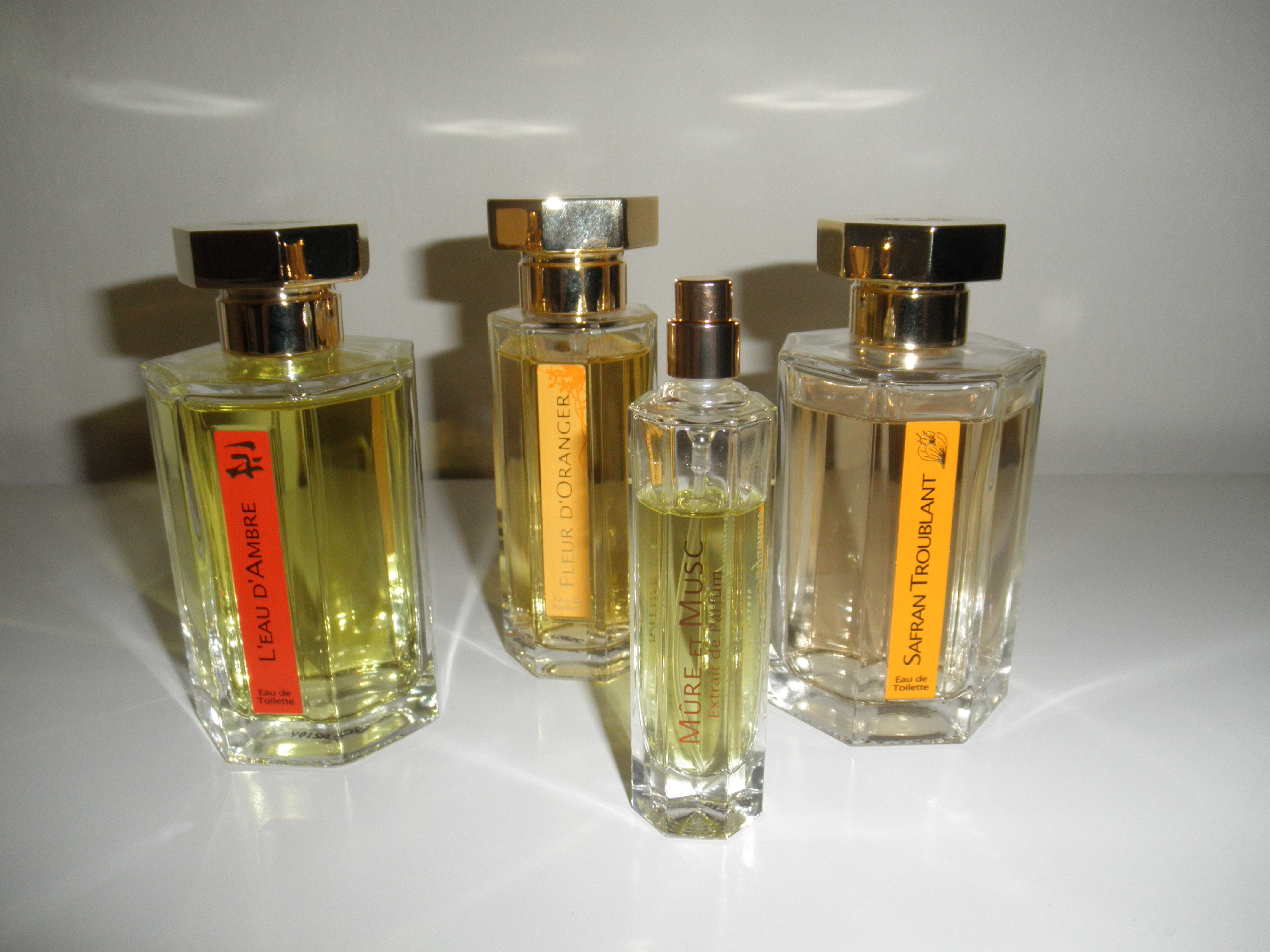 from left to right: L'Artisan L'Eau d'Ambre, Fleur d'Oranger, Mure et Musc extrait, Safran Troublant
