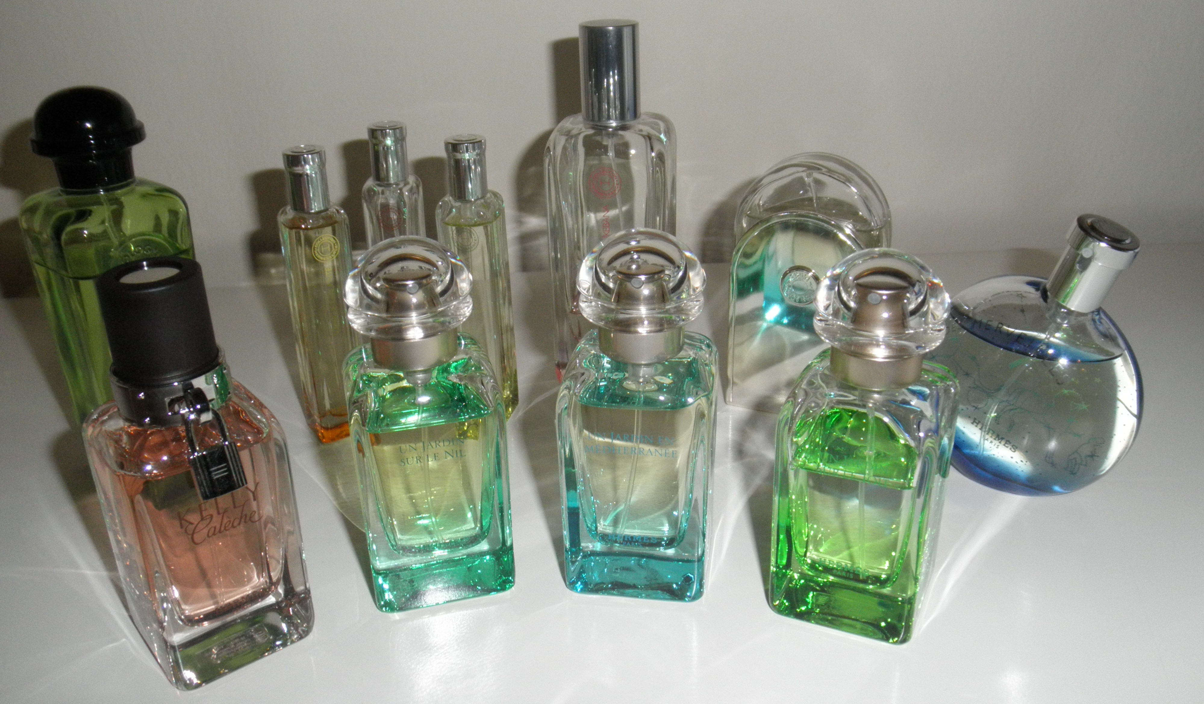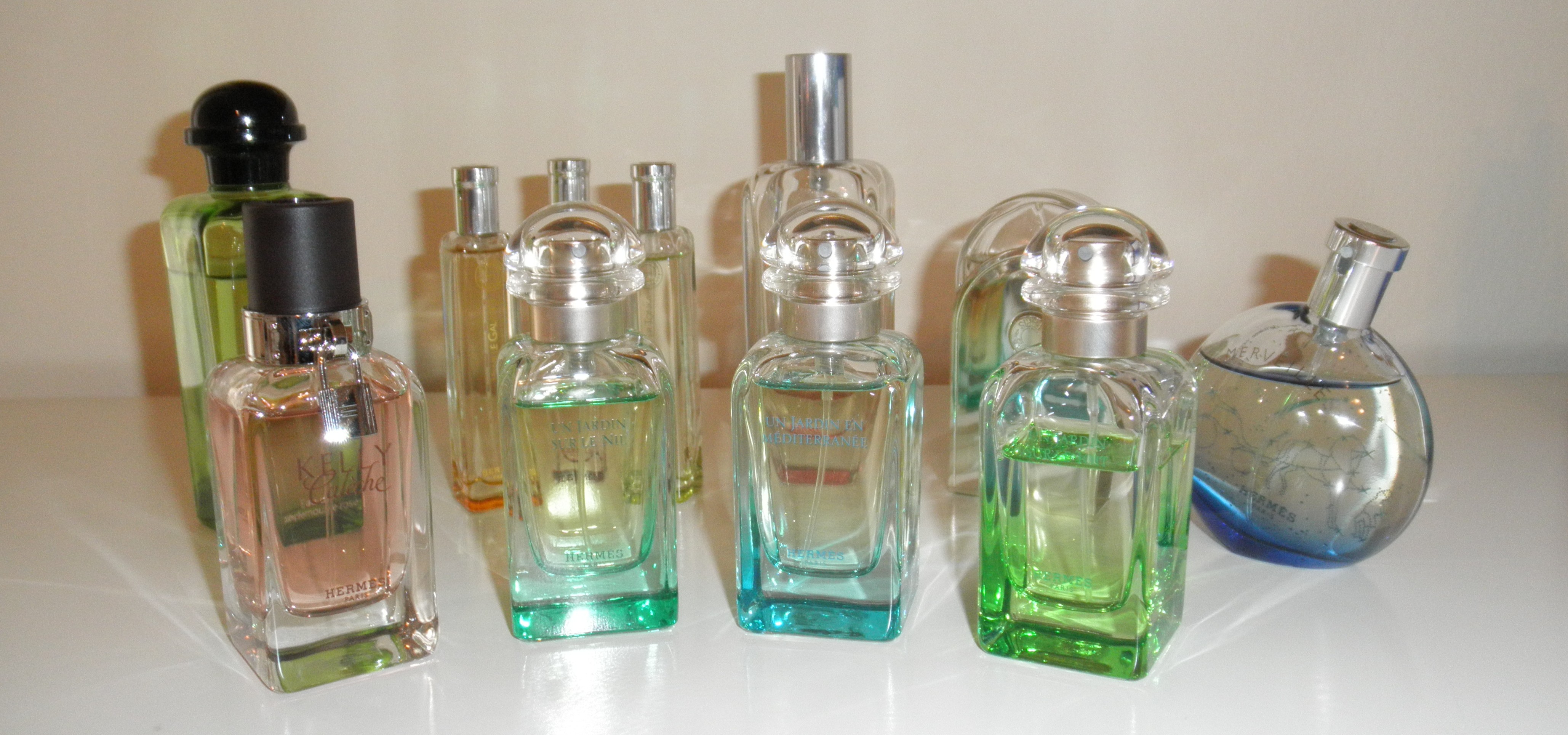 from left to right: Hermès Kelly Calèche, Eau de Pamplemousse Rosé, Un Jardin Sur Le Nil, Hermessence Vanille Galante, Osmanthus Yunnan, Vetiver Tonka, Un Jardin En Méditerranée, Rose Ikebana, Voyage d'Hermès, Un Jardin Sur Le Toit, Eau de Merveilles (limited edition bottle).