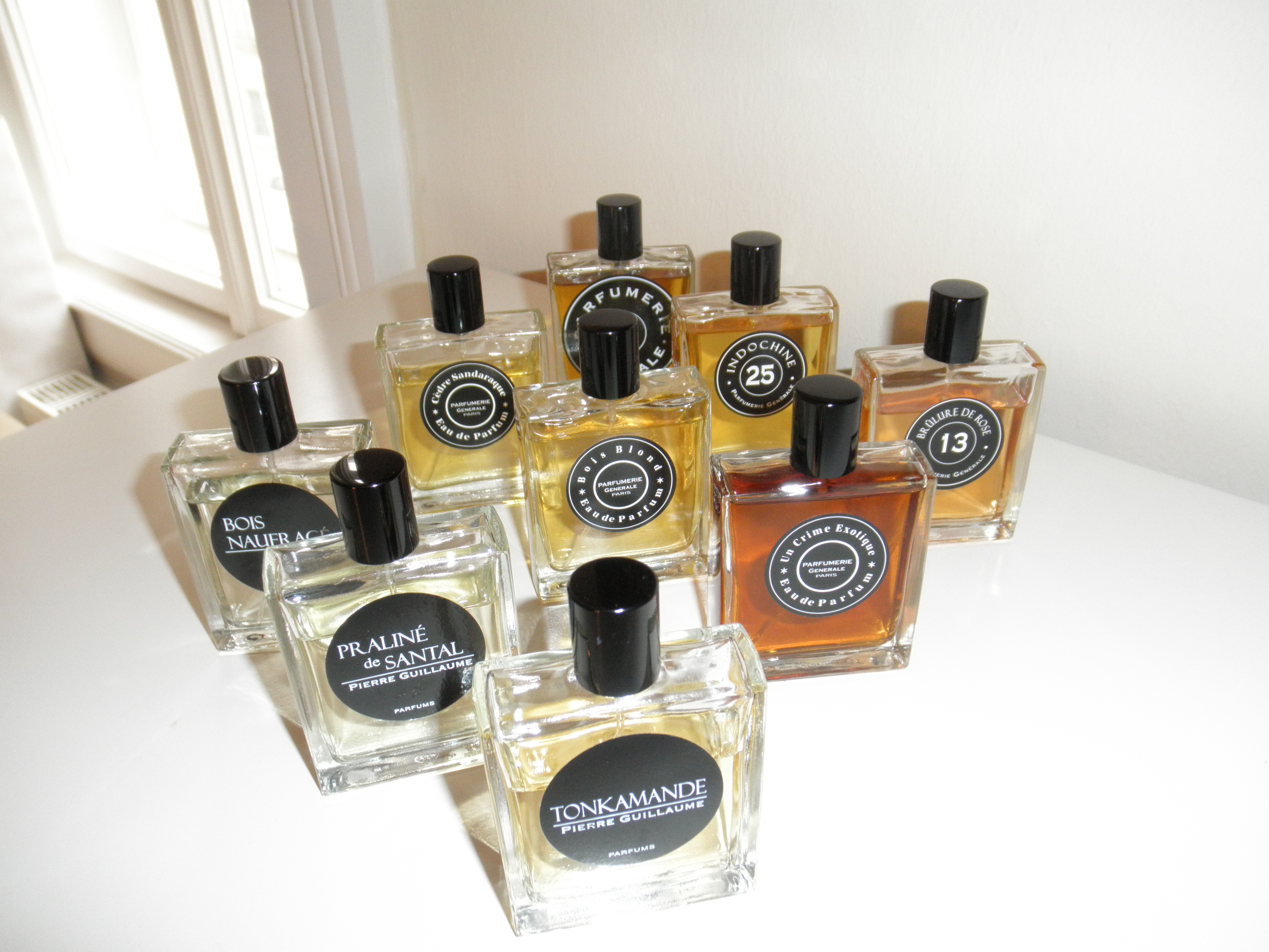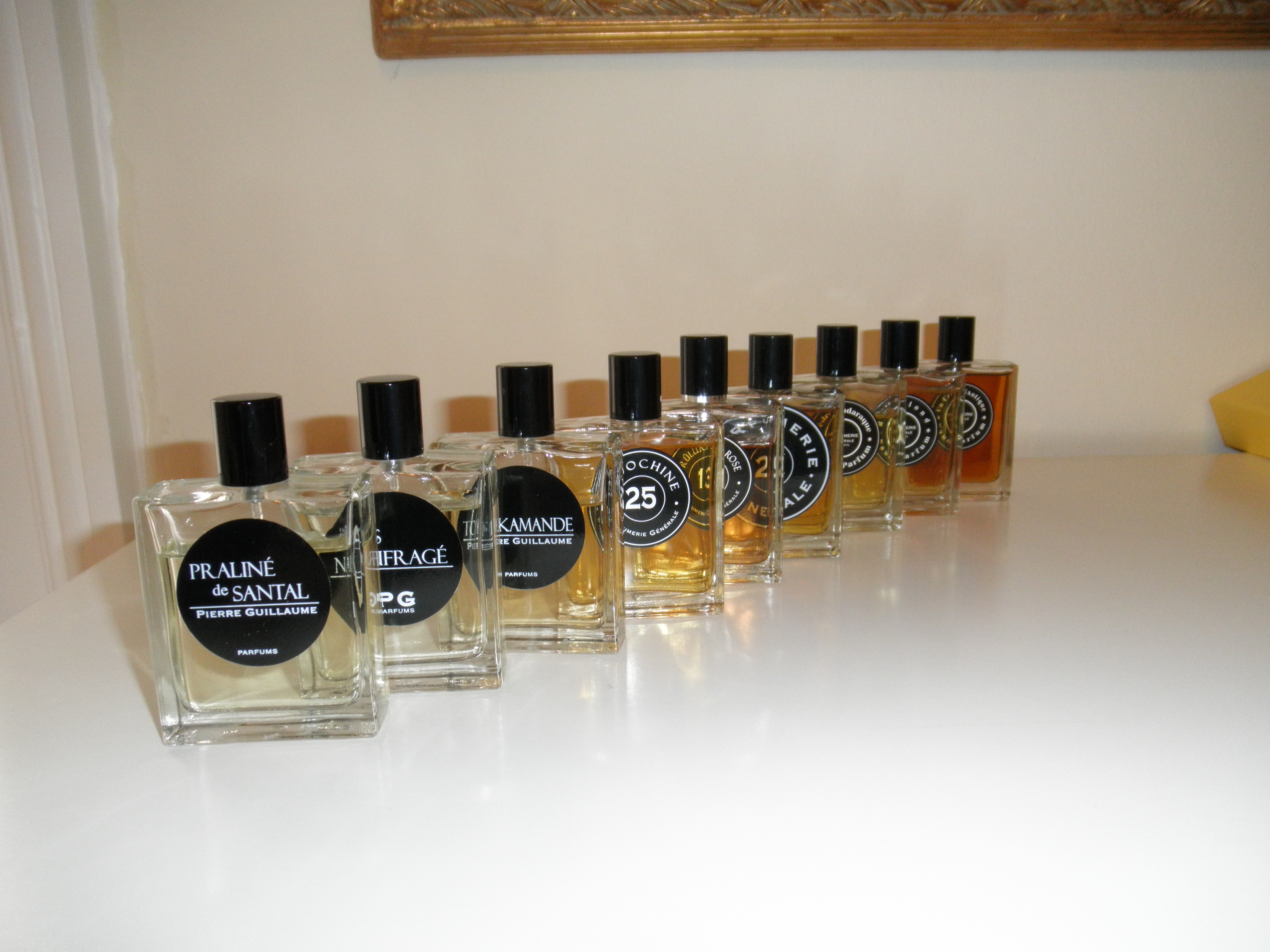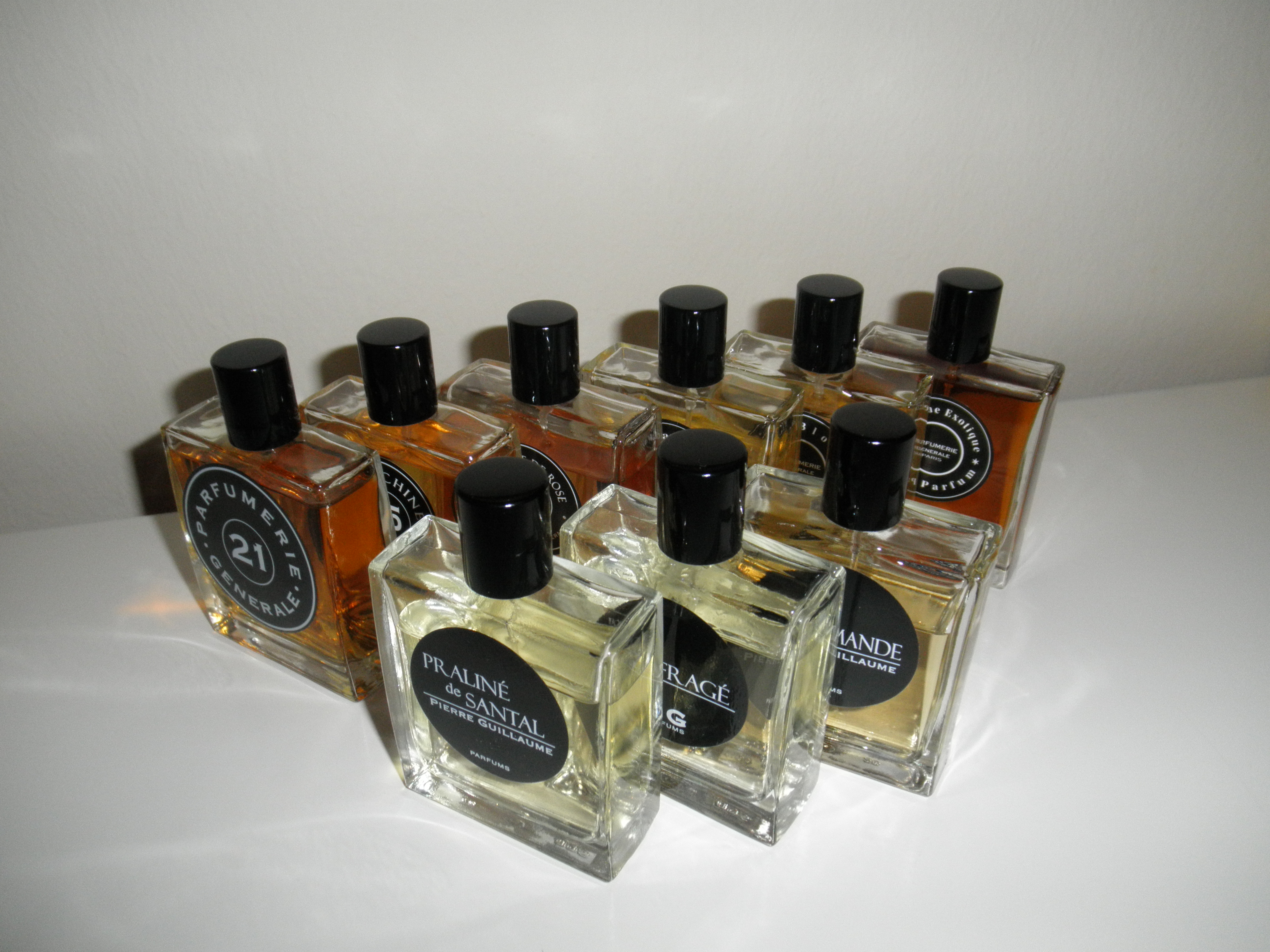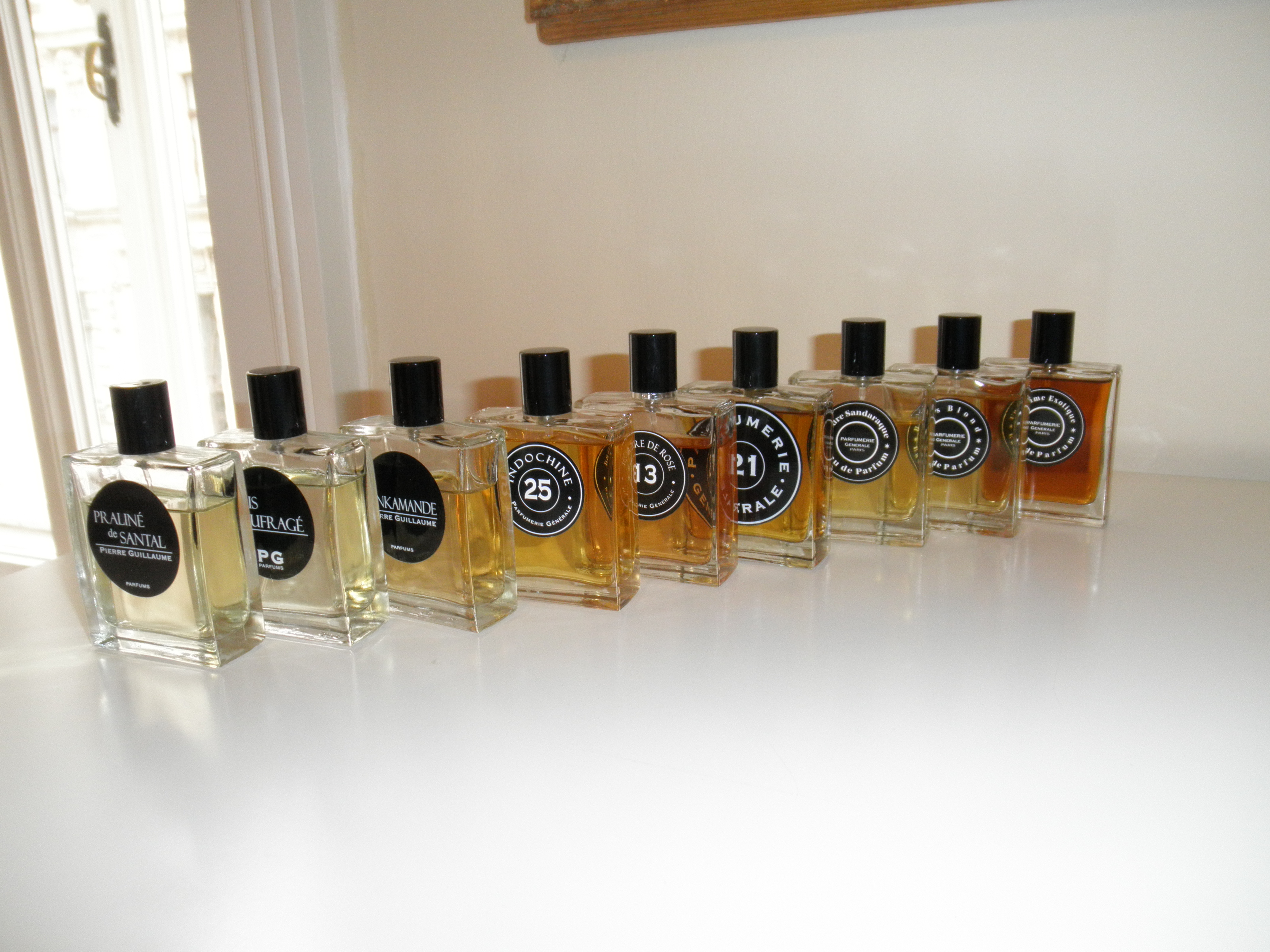 from left to right: Parfumerie Generale Felanilla, Praliné de Santal, Indochine, Bois Naufragé, Brulure de Rose, Tonkamande. Cedre Sandaraque, Bois Blonds and Un Crime Exotique.