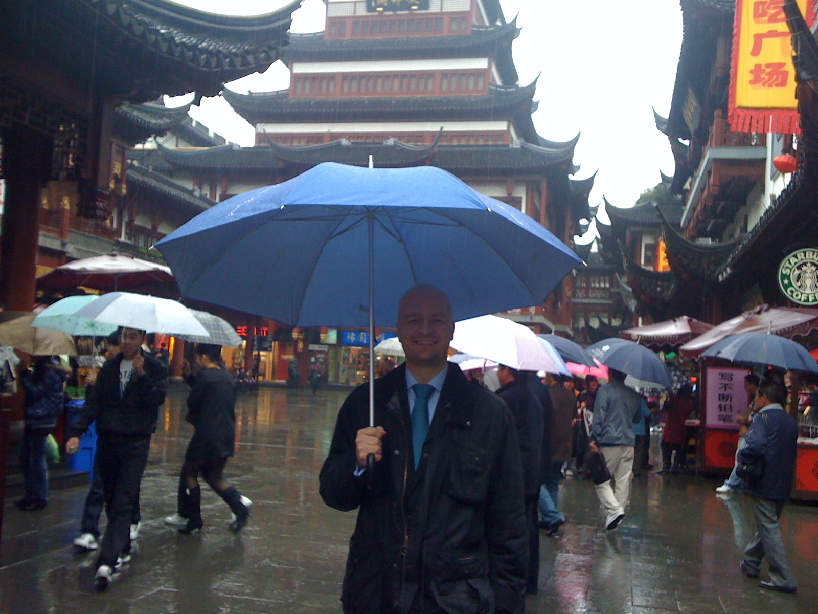This picture of my husband in Shanghai, in front of the wooden structure in the rain, is what this perfume encapsulates in its bottle (if you disregard the Starbucks in the corner!).