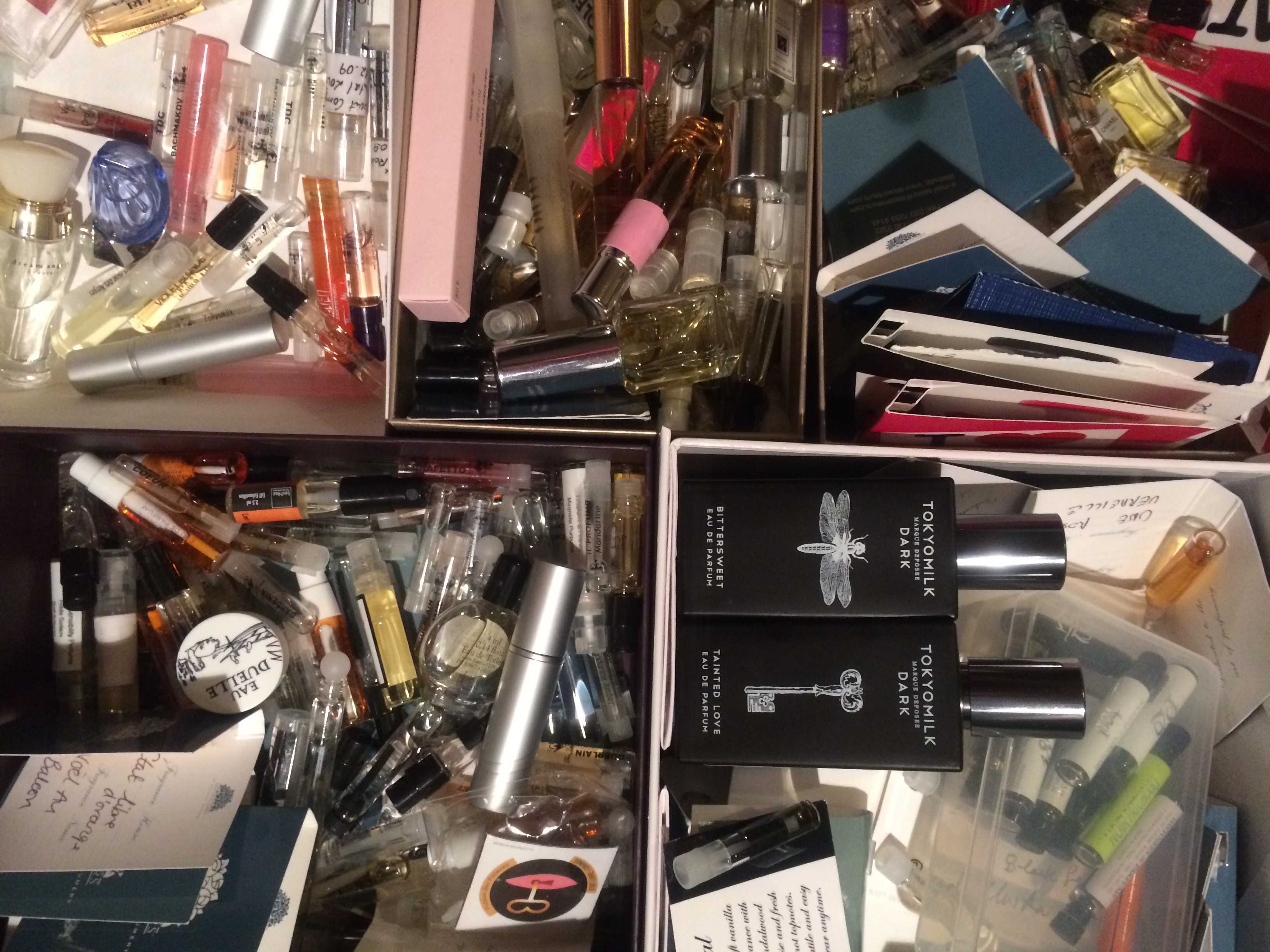 She wants to give away her extensive sample collection plus two full size bottles (Tokyo Milk Bittersweet and Tainted Love) to one lucky OT reader.
