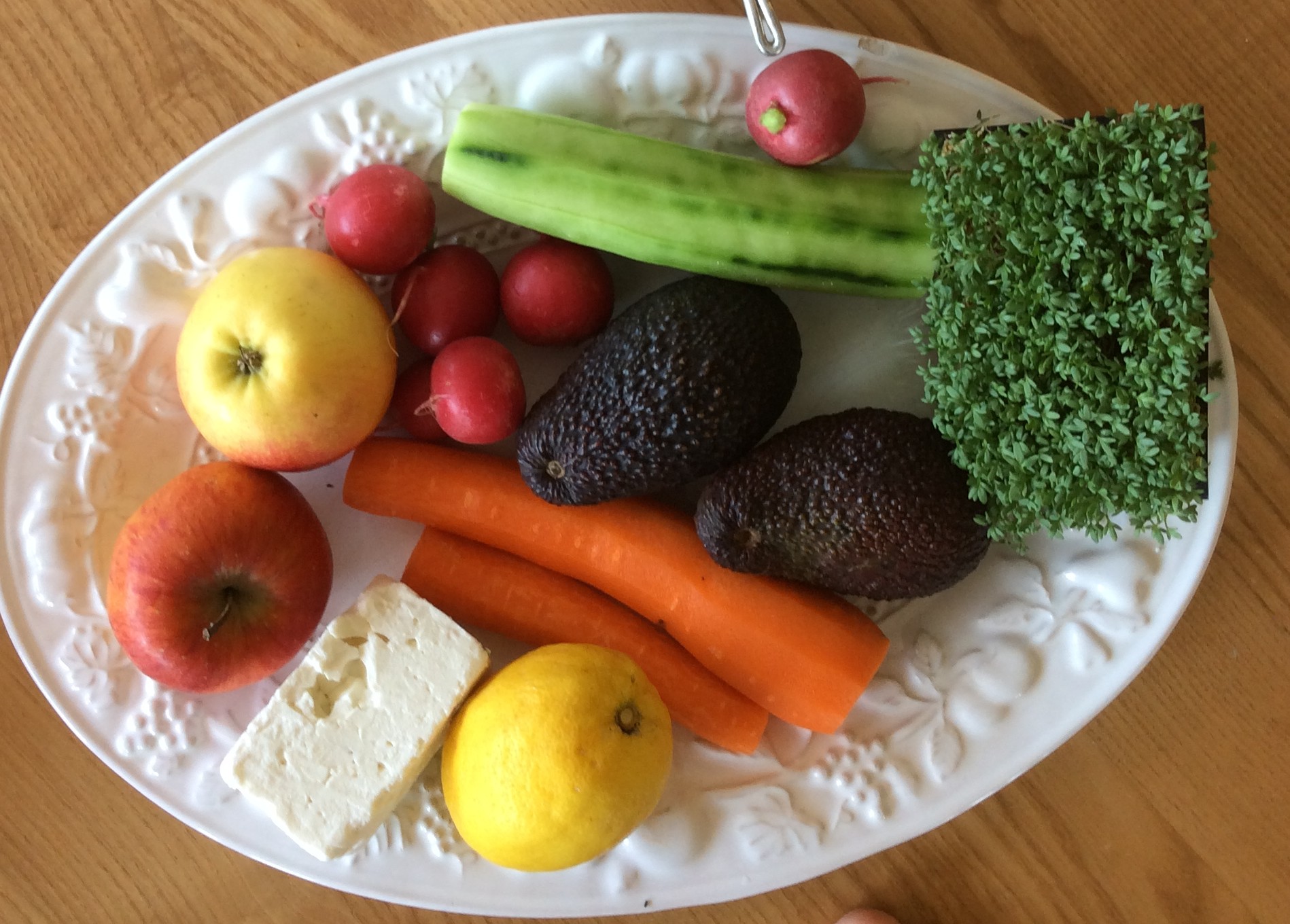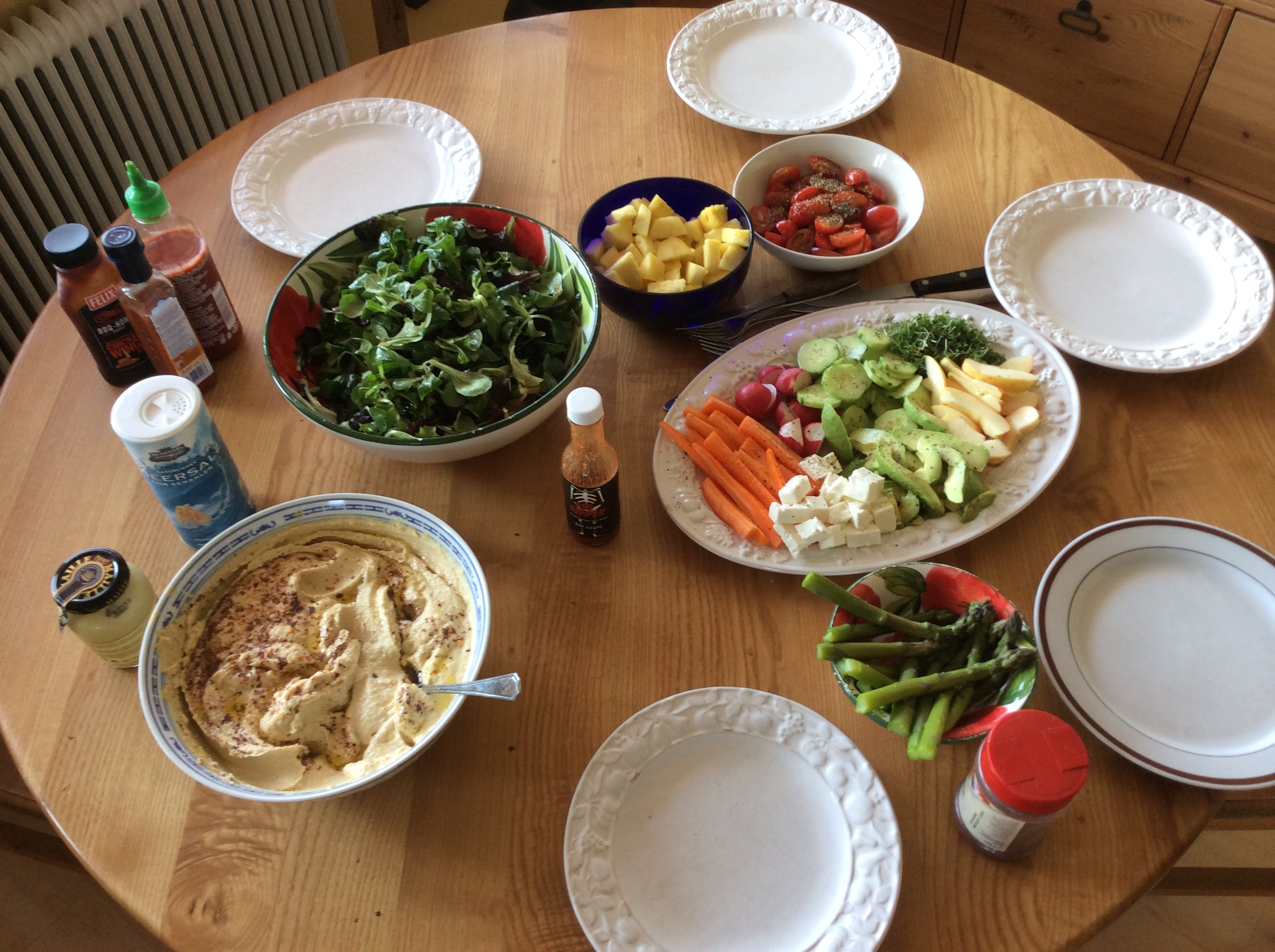 We never have dinner without a plate of chopped fruit and vegetables in the middle of the table. We have eaten this way for nearly thirty years. Whether it’s a curry, or pasta, or Mexican, or meat, it’s there. Of course it changes with the seasons.