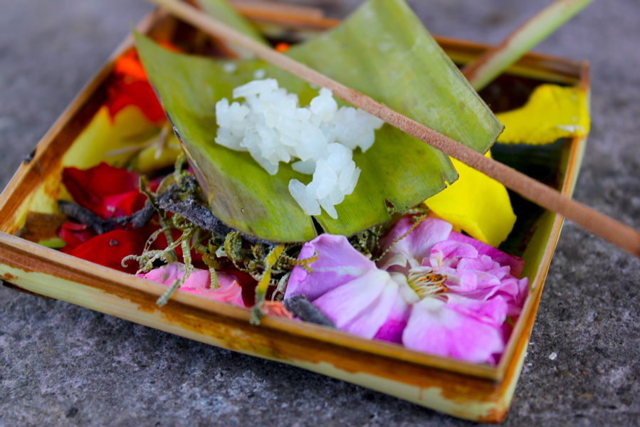While wearing Fils de Dieu I’m reminded of the little offerings (known as “canang sari”) I saw on the streets outside homes while on holiday in Bali. Everyday there would be a new, artfully woven palm or banana leaf bearing fruit, flowers and a small amount of rice.