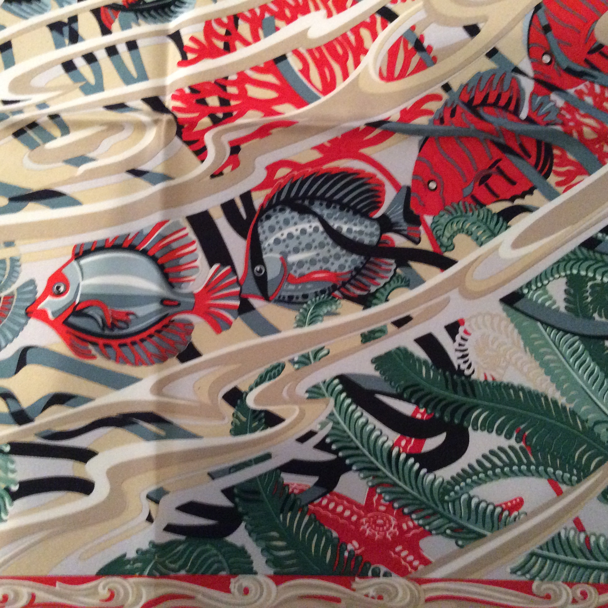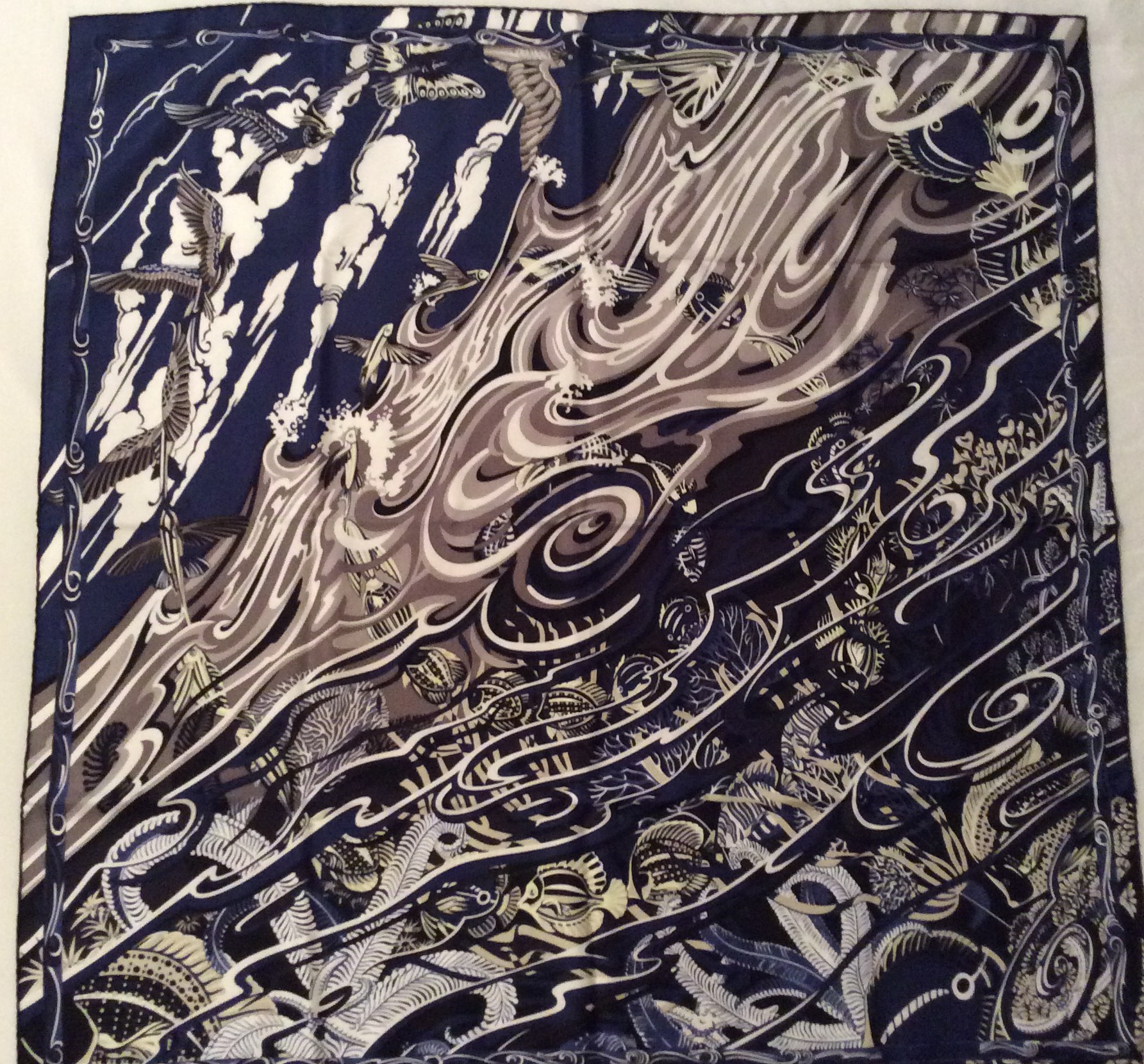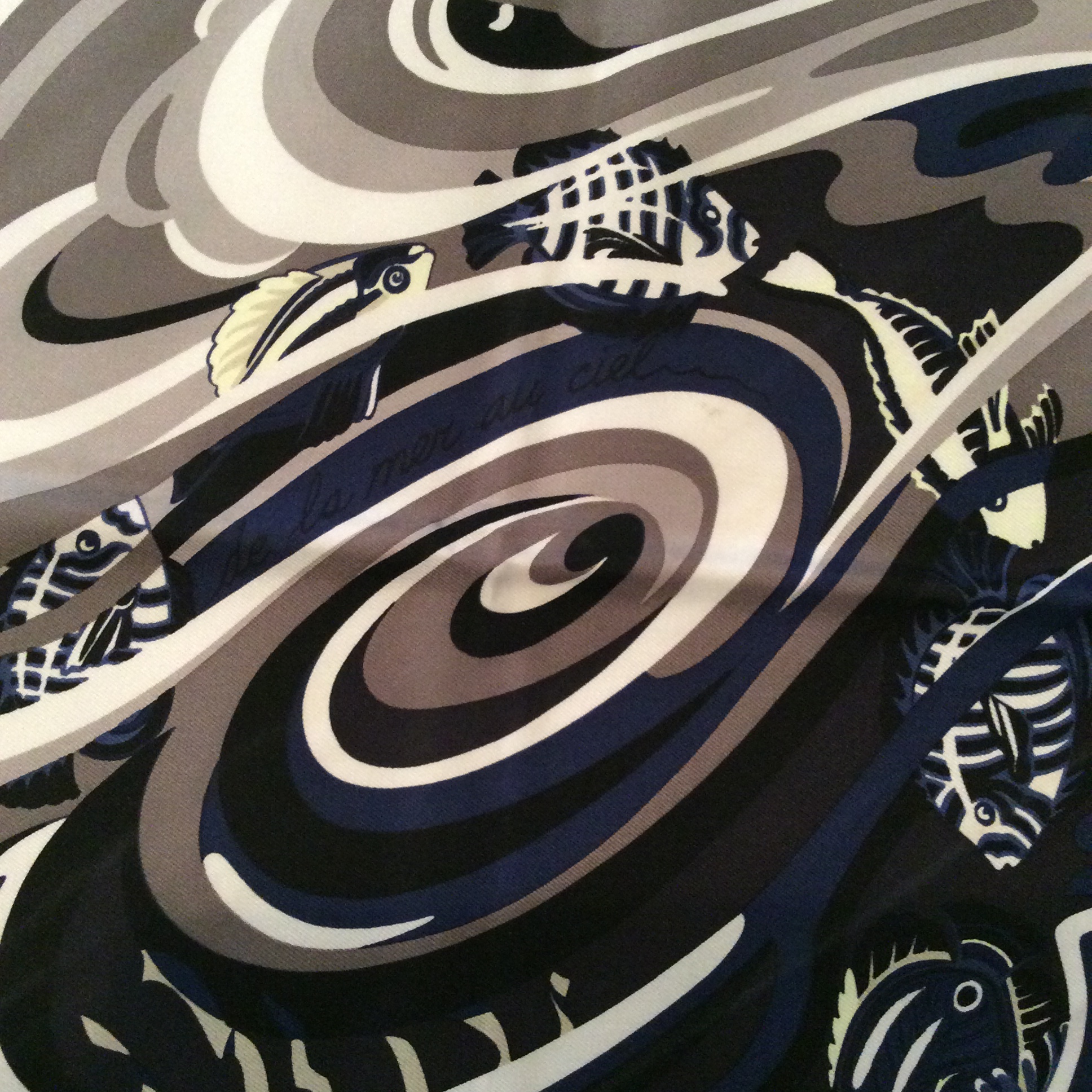 Two beautiful scarves. The first one, for me, illustrates how I feel when I am somewhat stressed and would be wonderfully expressive to wear at such a time!! However, when you look at the fish on the folds, it calms down and you can see the details much more clearly…