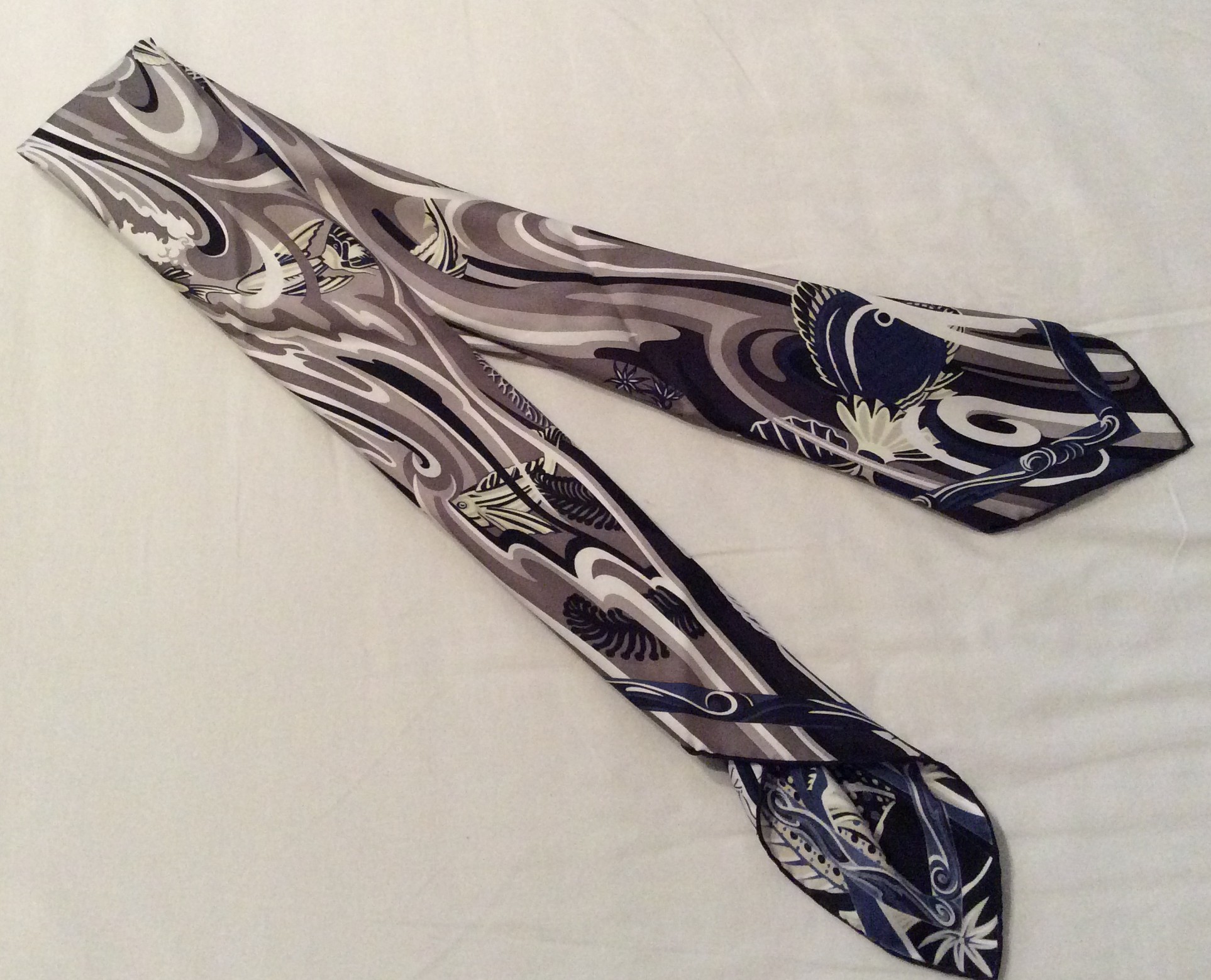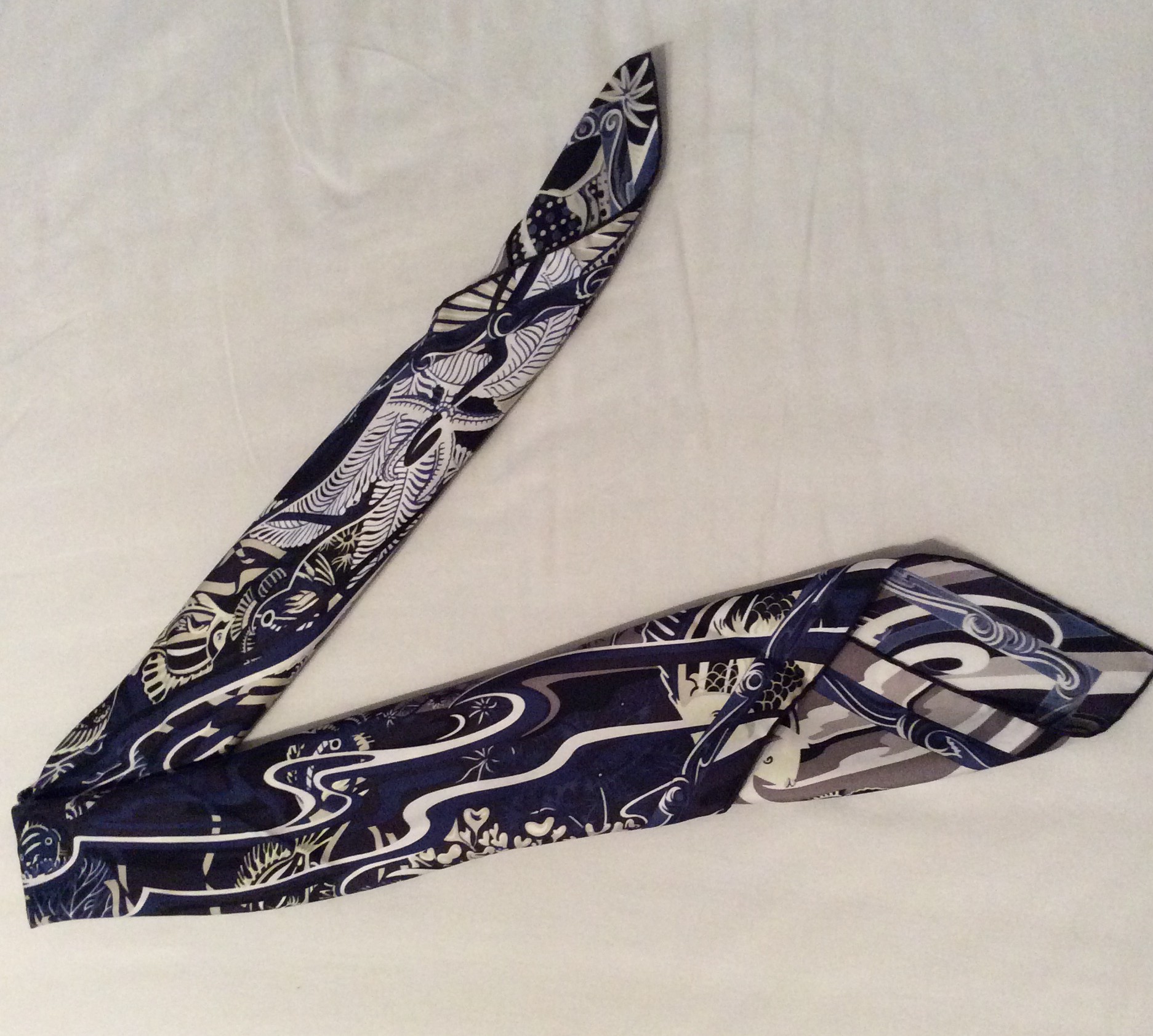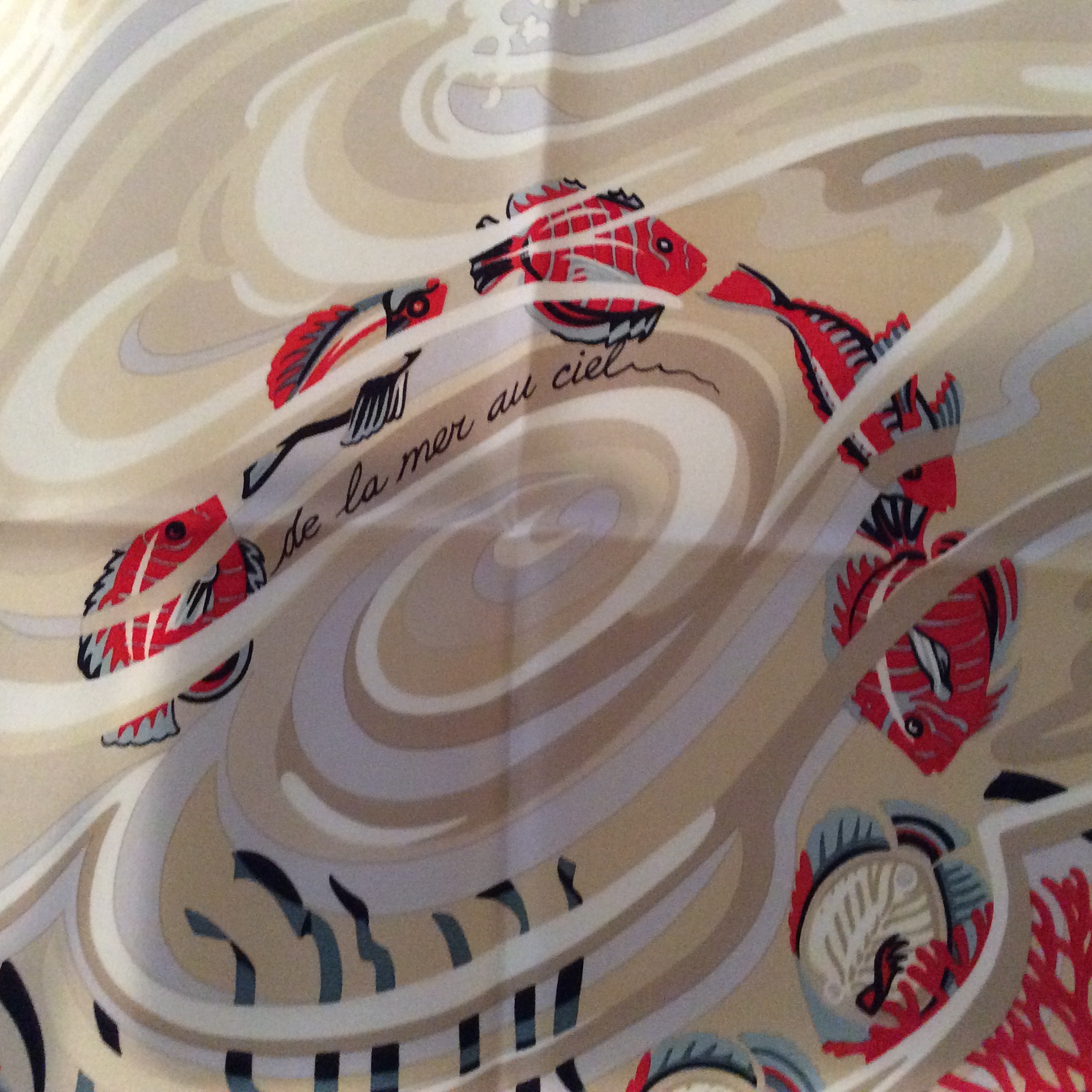 Two beautiful scarves. The first one, for me, illustrates how I feel when I am somewhat stressed and would be wonderfully expressive to wear at such a time!! However, when you look at the fish on the folds, it calms down and you can see the details much more clearly…