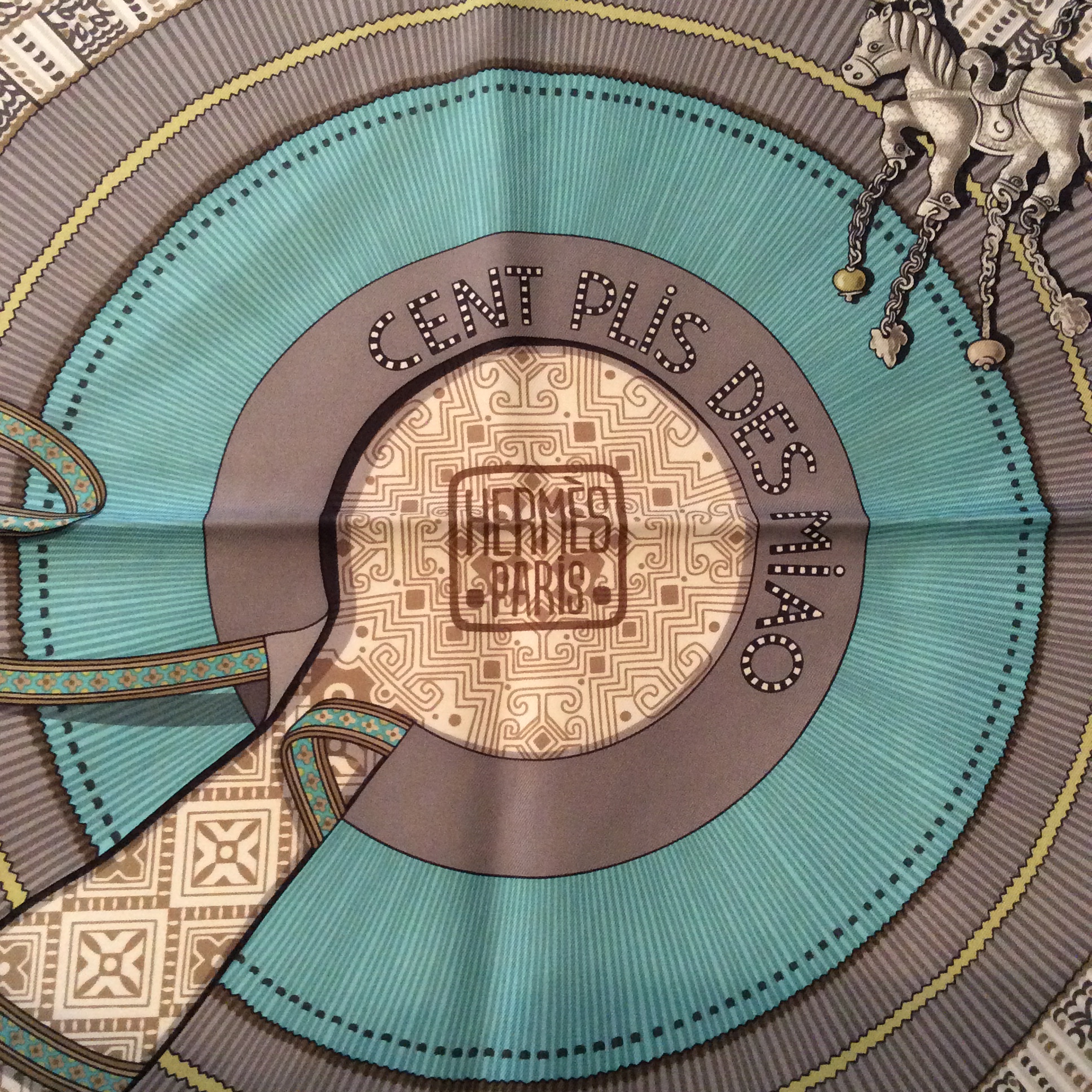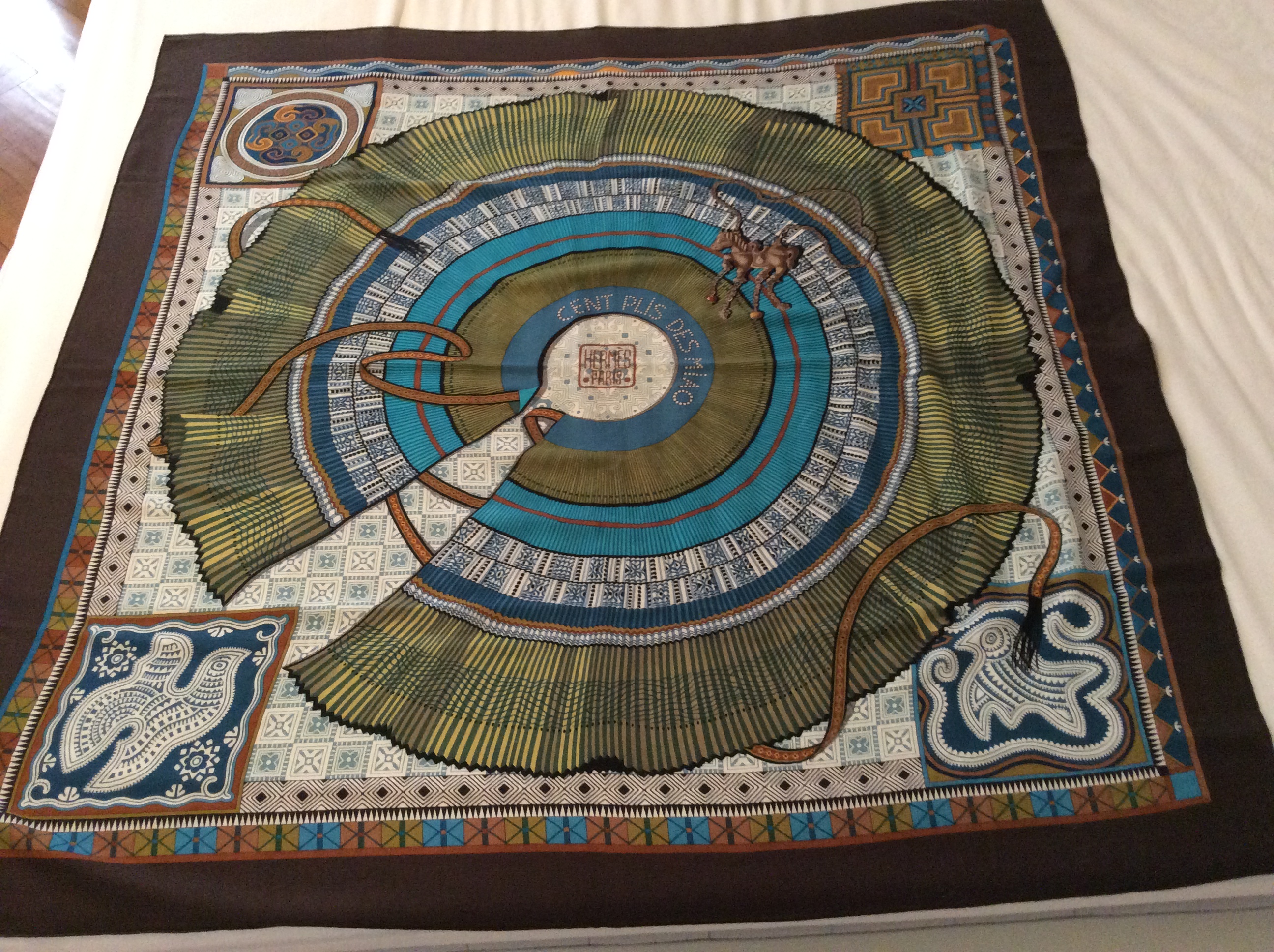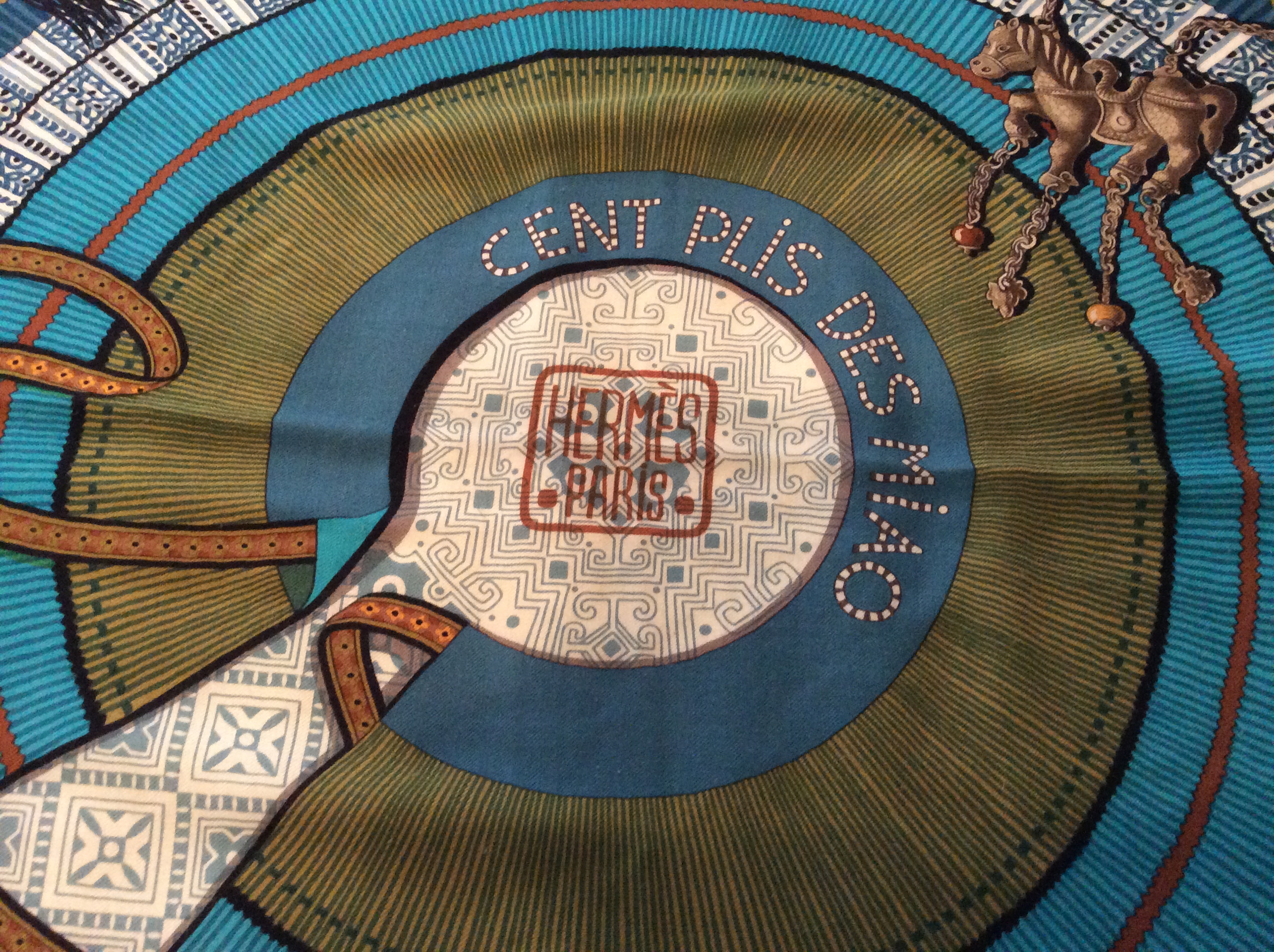 The Hermes Paris “seal” at the center of the Cent Plis design is very clever. It quietly comments on the east-west cultures and influences at play in this lively design. I think it is a gentle reminder that silk (from sericulture to silk-screen) are gifts from the Eastern world to the West. I love it!