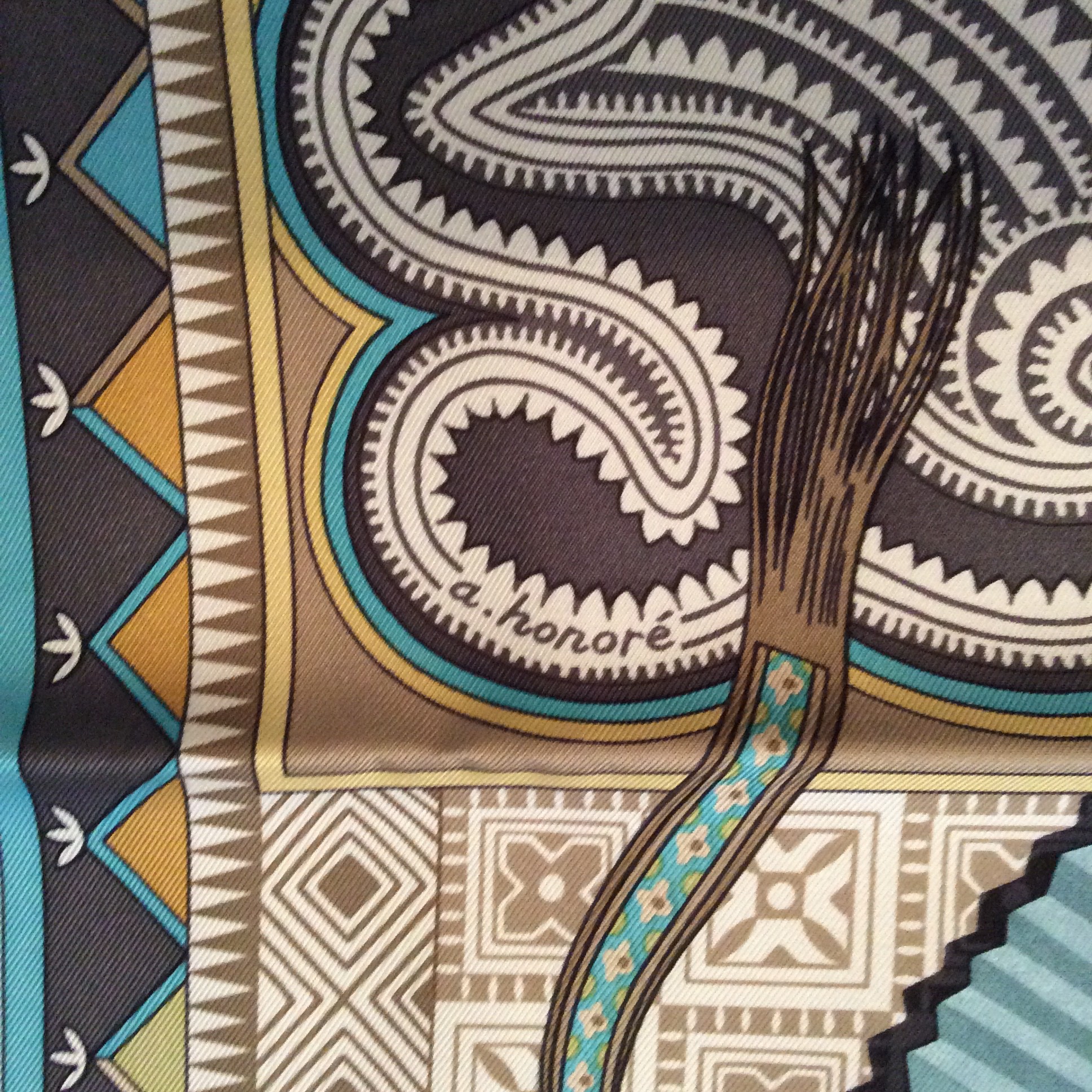 In this detail you can see the designer’s signature. Many, although not all, Hermès scarfs bear a signature somewhere, often well-hidden within the design.