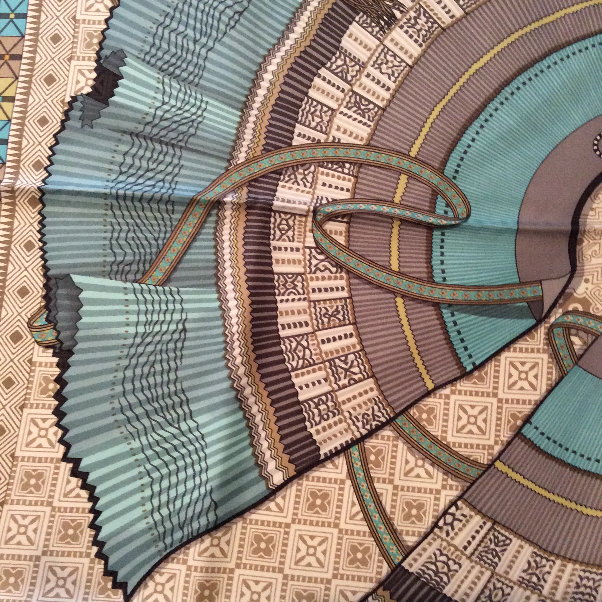 In the smaller (90×90) silk version, the skirt and its pleats seem more delicate, also the lighter pale grey, taupe and turquoise colour scheme give the scarf a very different vibe. This one is more elegant, refined and subtle that its more earthy big sister.