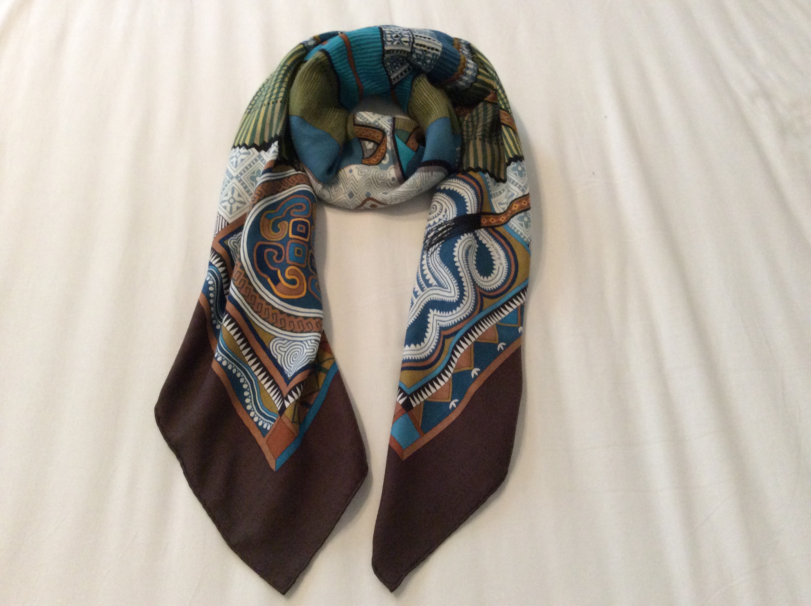 Birgit, I love the way the large cashmere-silk scarf looks when it’s folded, with that combination of browns and blues, with a touch of olive green. I’m sure it does feel like a hug. I love your story about the silk version, too, and I have to say that if it does have your mark on it now, it’s not visible to my eye. It looks pristine to me!