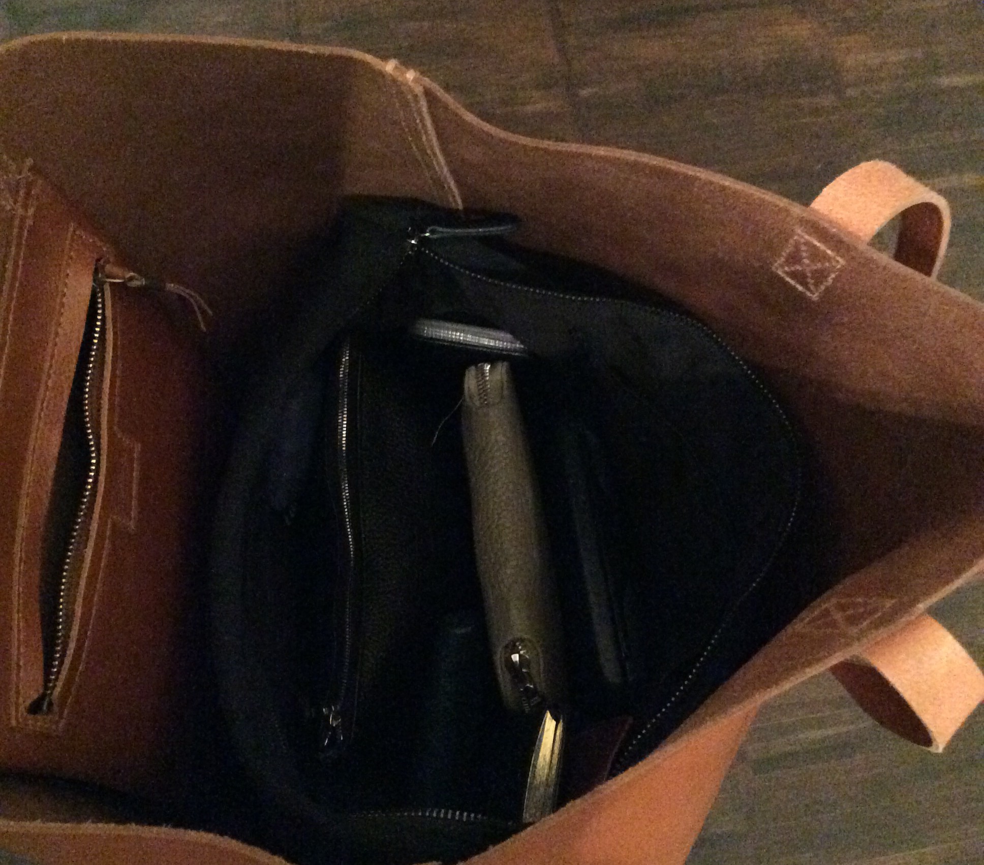 Peeking inside you can see a small inner pocket on one side where I keep my phone and a lip balm, The main compartment holds all the rest.