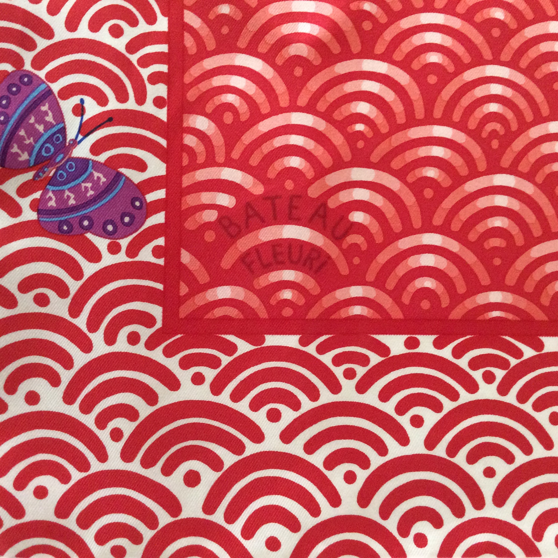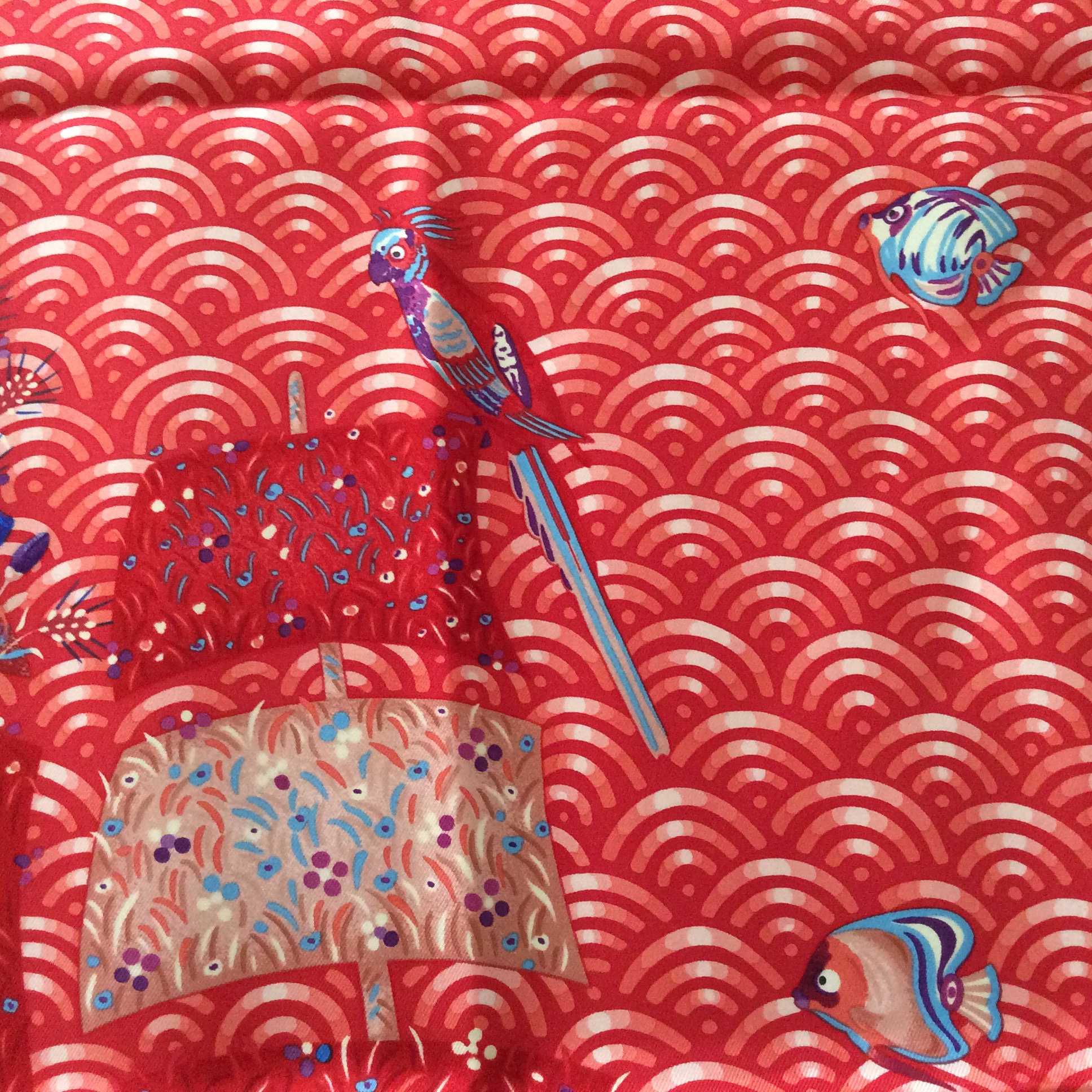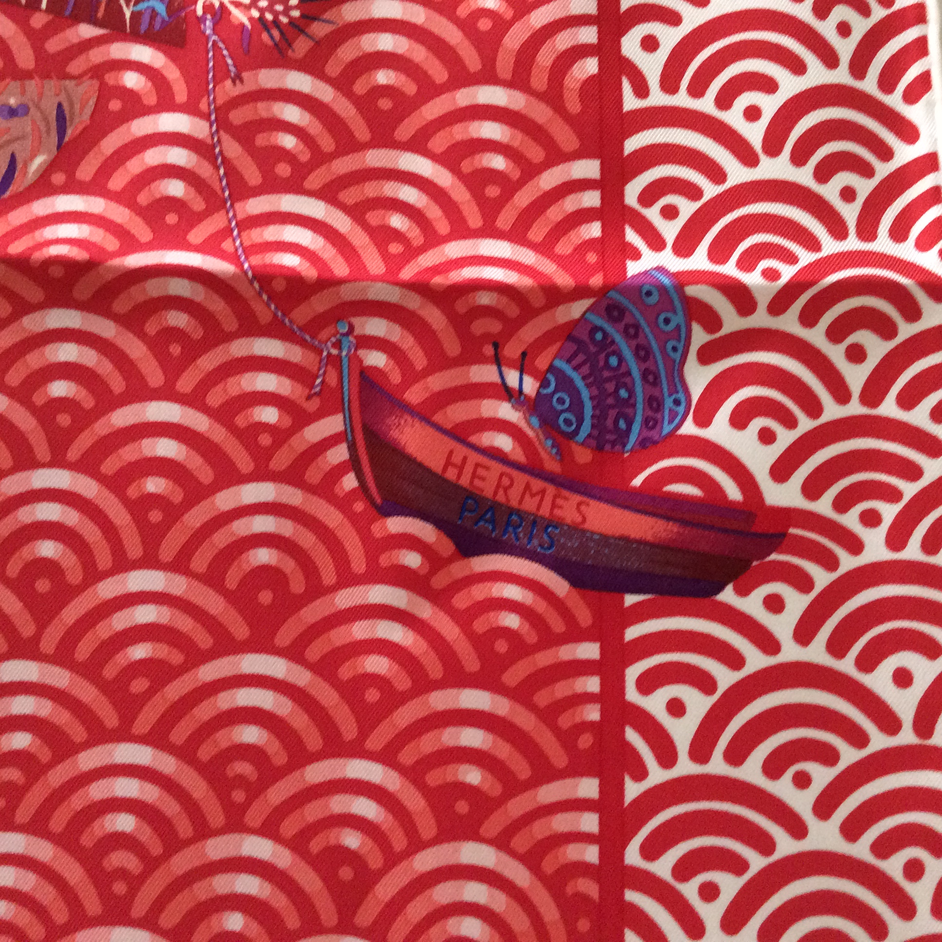As a lover of Japanese design (including fabrics), I can tell you that the background pattern of the red scarf is a traditional Japanese pattern called “rising sun.” The butterflies also add a sort of Hanae Mori inspired quality. The rest of it–especially the boat–doesn’t feel Japanese at all. But when tat scarf is folded up, it looks very Japanese to me. (I actually collect Hanae Mori scarves.)