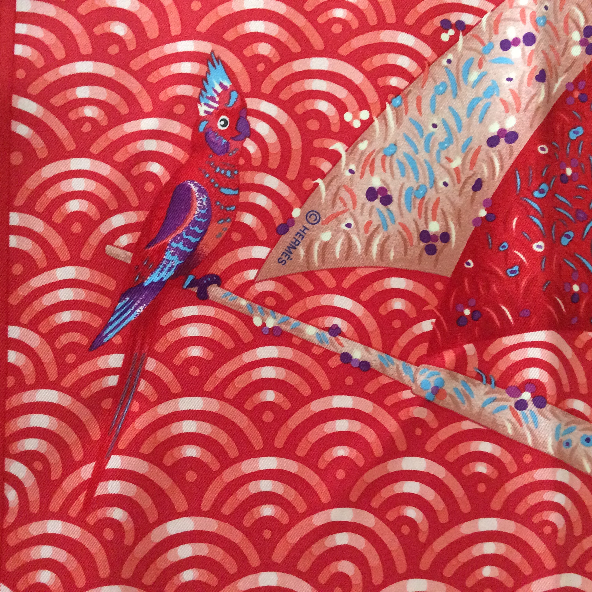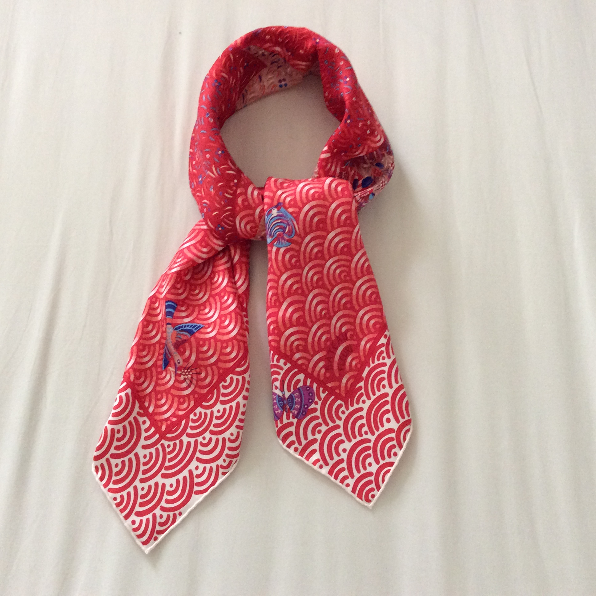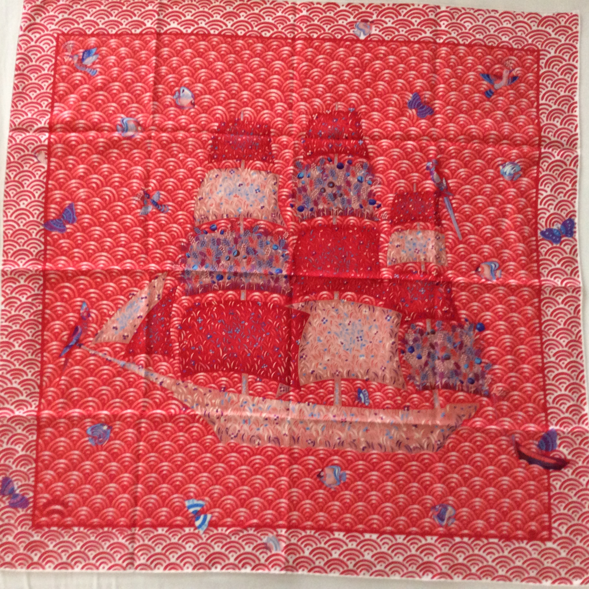 As a lover of Japanese design (including fabrics), I can tell you that the background pattern of the red scarf is a traditional Japanese pattern called “rising sun.” The butterflies also add a sort of Hanae Mori inspired quality. The rest of it–especially the boat–doesn’t feel Japanese at all. But when tat scarf is folded up, it looks very Japanese to me. (I actually collect Hanae Mori scarves.)